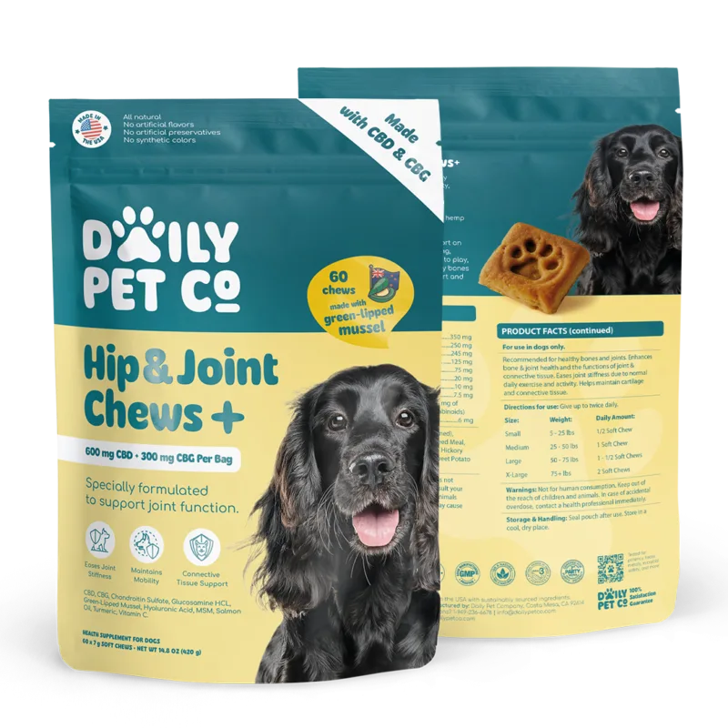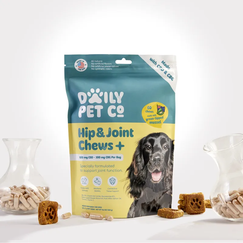 Daily Pet Co. Hip & Joint + CBG Chews help keep tails wagging, paws moving, and adventures going strong.